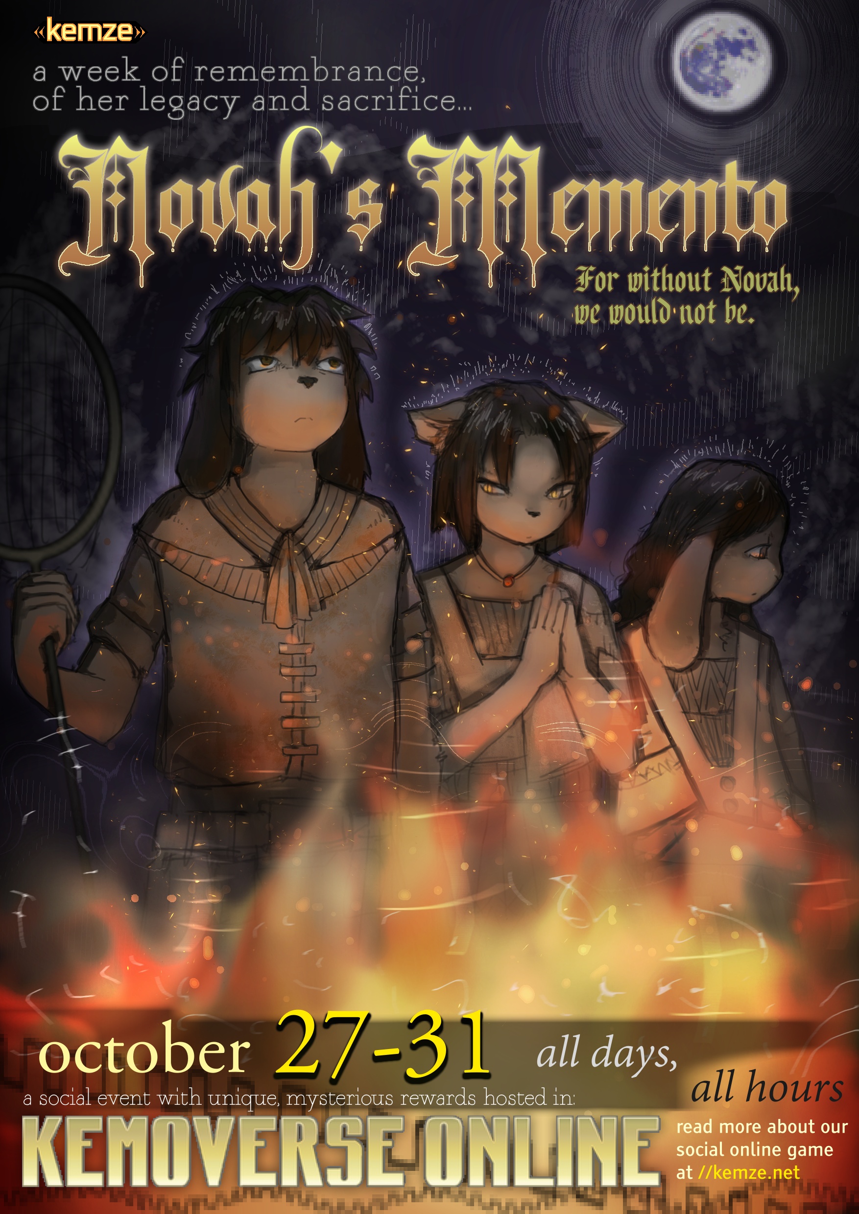 Welcome to Novah's Memento, a yearly lore event commemorating the death of Novah, the ancestor of all Kemona. Come attend to recognize her story of sacrifice for the survival of Kemonae and learn about the ancient legends and traditions - and participate in the campus rituals to receive unique event-only items! The event applies through the last week of October and will offer you special NPC dialog, storylines, item rewards and a mysterious, yet cozy, atmosphere throughout the campus.